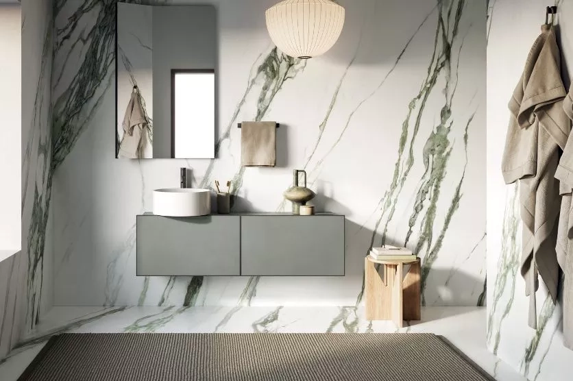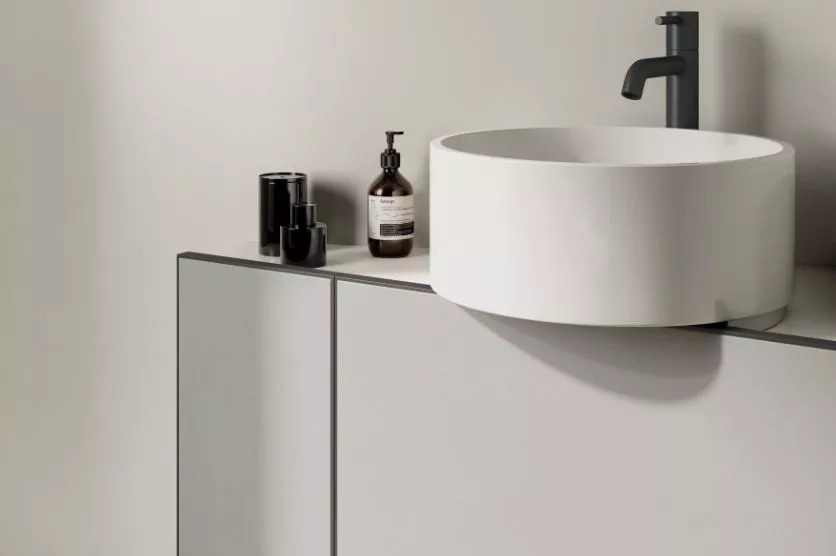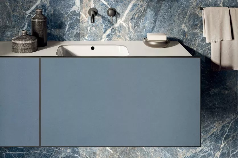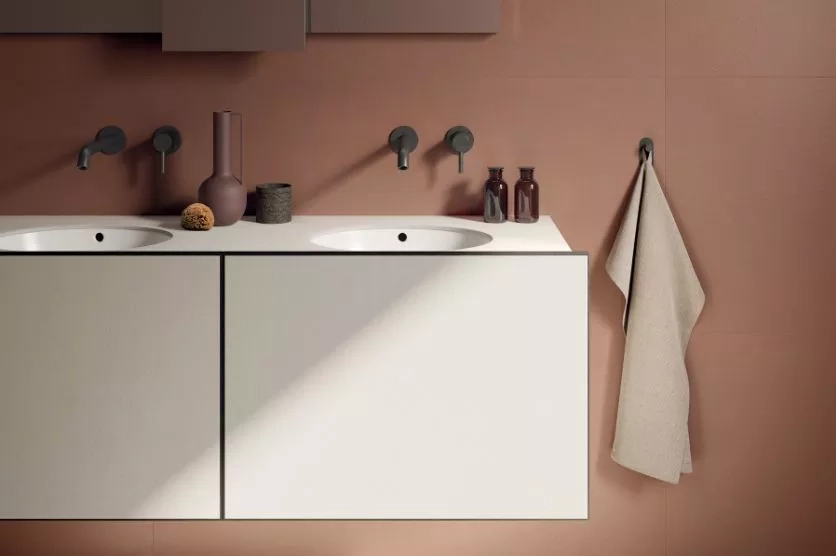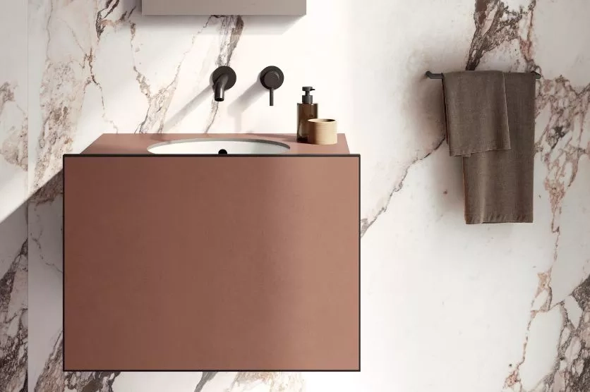 Entièrement personnalisables, les meubles de salle de bains LOOM sont revêtus de dalles et de mosaïques en grès cérame (6mm d’épaisseur), et reçoivent des vasques en céramique dédiées, à poser ou à encastrer. Un choix de conception qui associe performances techniques, fonctionnalité et durabilité, pour un design qui s’harmonise parfaitement avec les sols et les murs.