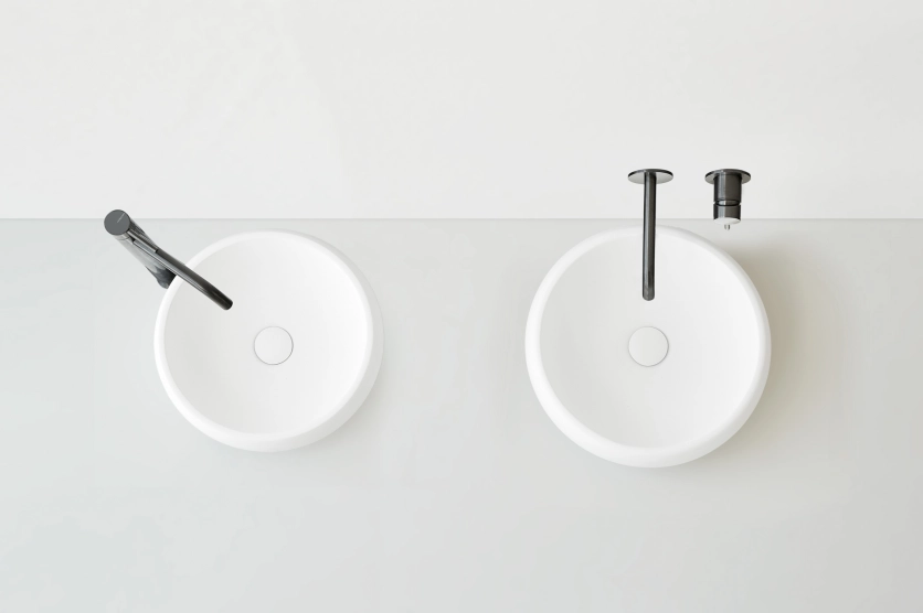 Baignoire Rondo îlot. Disponible en blanc brillant et blanc mat. 150x75 et 170x80 cm. Vasque Rondo à poser bol rond gel coat blanc mat diamètre 36 et 40 cm.