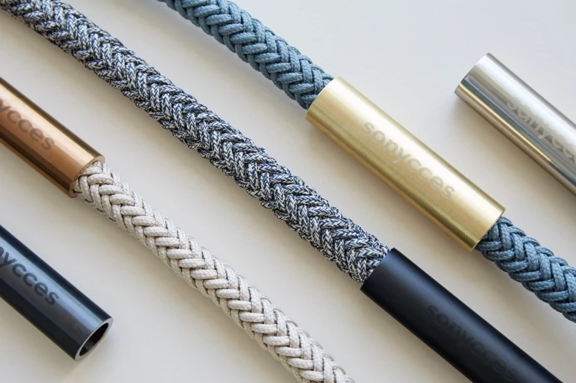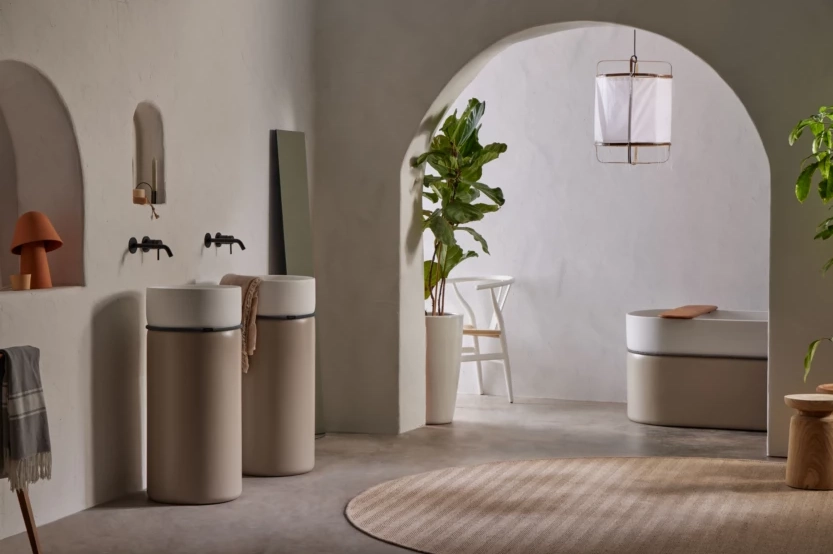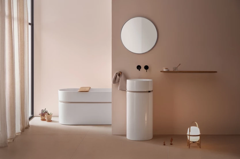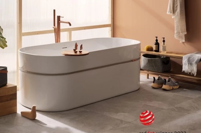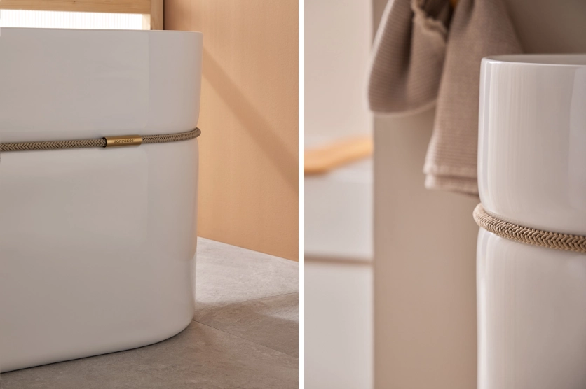 Magnifique baignoire îlot, un détail textile l' entoure, une corde attrape l'instant. Bonde click-clack et débordement intégrés. Option plateaux de baignoire.