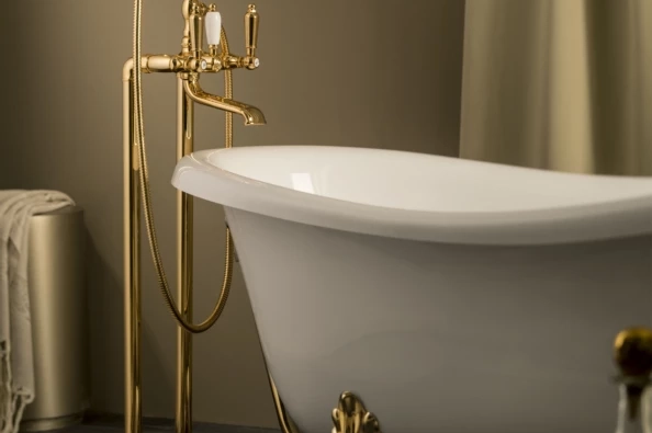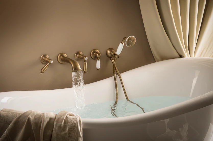 Daytime est une collection de mélangeur de lavabo, bain et douche destinée aux amoureux du style Anglais. Les coloris bronze brossé et or sont mis à l'honneur.